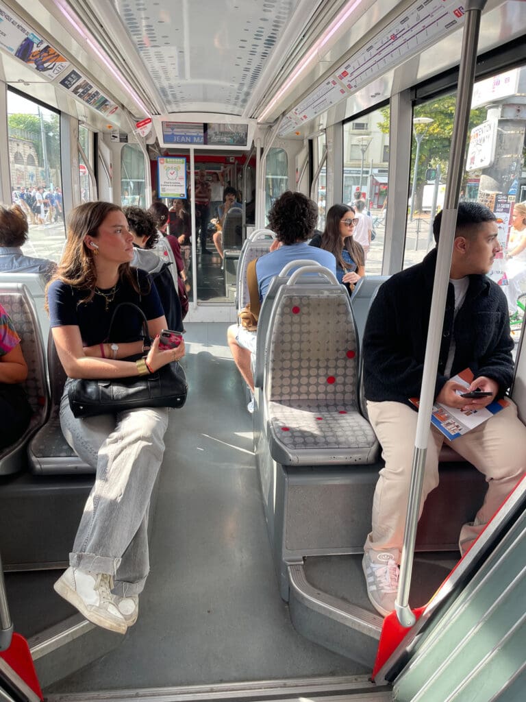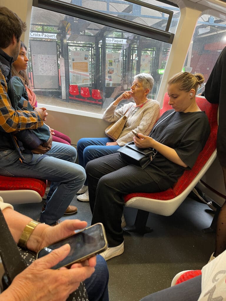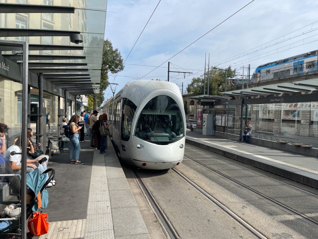 Metron är byggd uppifrån nära gatuplanet och med sidoplattformar. Det innebär att man redan från gatuplanet måste veta vilken nedgång man måste ta. Vi behövde åka två metrolinjer för att komma rätt. Givetvis åkte vi åt fel håll, men upptäckte att vi kunde byta till spårvagn T2 och vips var vi framme. Senare visade det sig att spårvagn T1 gick direkt från stationen Lyon Gare-part-dieu till dit vi skulle. Det gäller bara att ställa in Google så att den visar annat än enbart metro.