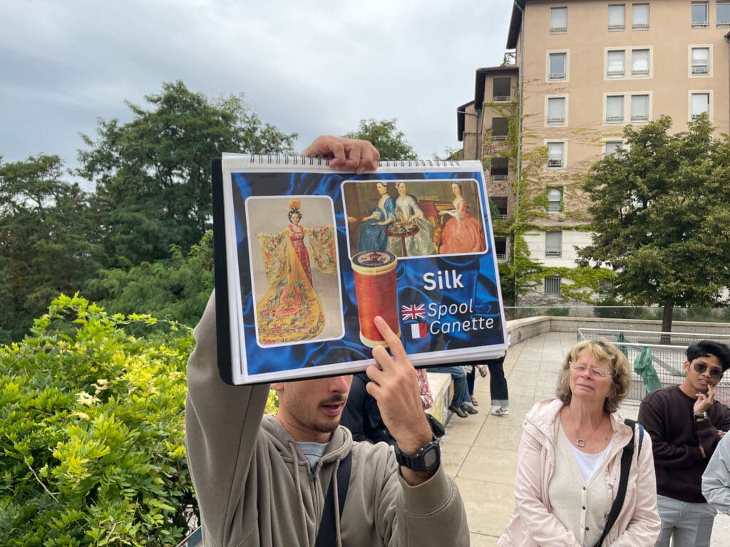 Quentin berättar med tydlig stämma och mycket humor hur livet tedde sig för silkesindustrin på 1800-talet. På den tiden odlades mullbärsträd i regionen och silkesmaskarnas kokonger togs om hand av textilarbetarna, canuts. Vi förflyttar oss i tiden till 1800-talet. Med jämna mellanrum visar Quentin planscher i A3-format med bilder. Han är noga med att alla ska se.