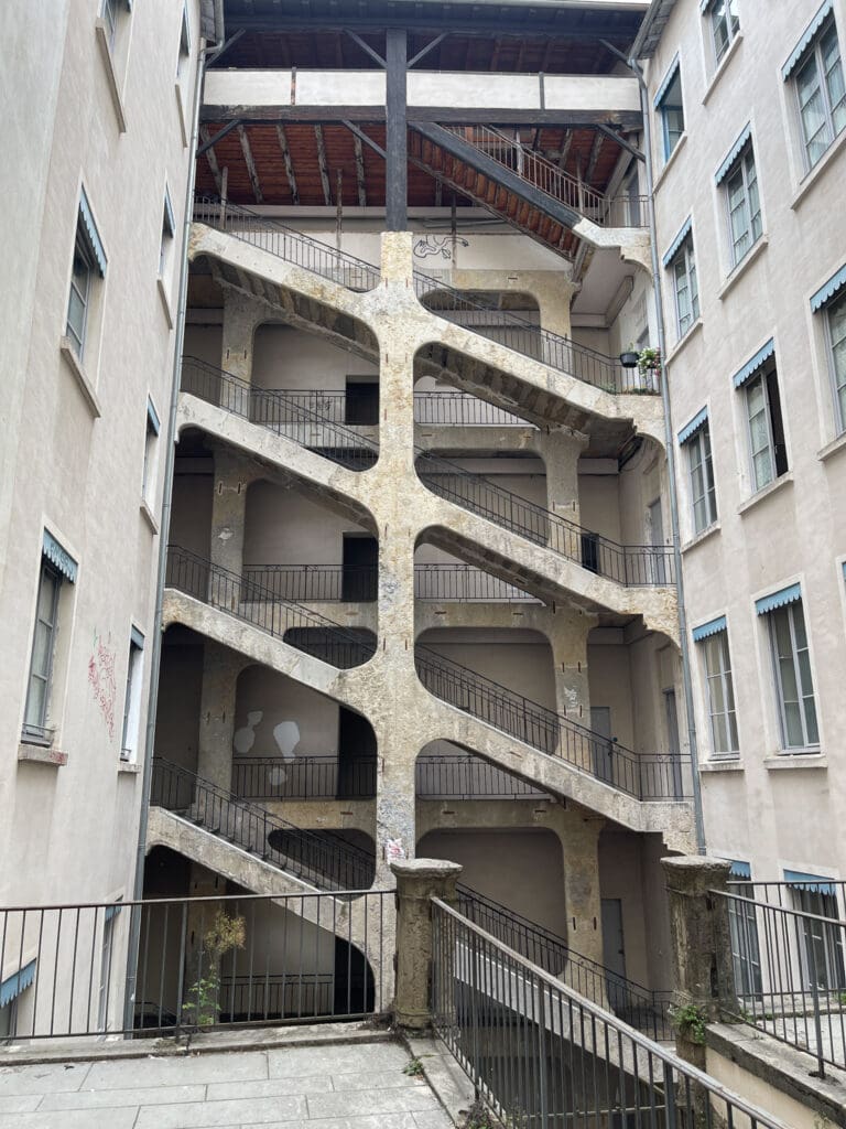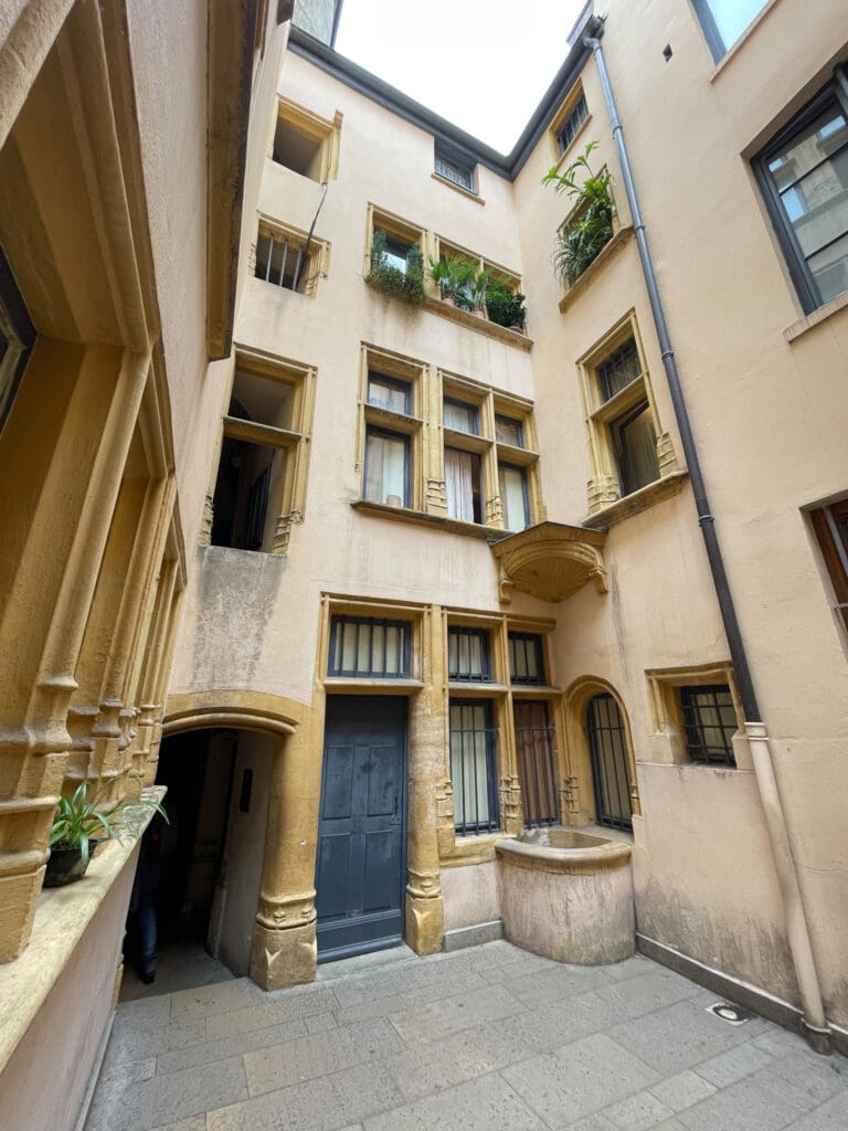 En innergård som var mötesplats för motståndsrörelsen. Nere till vänster en traboule.