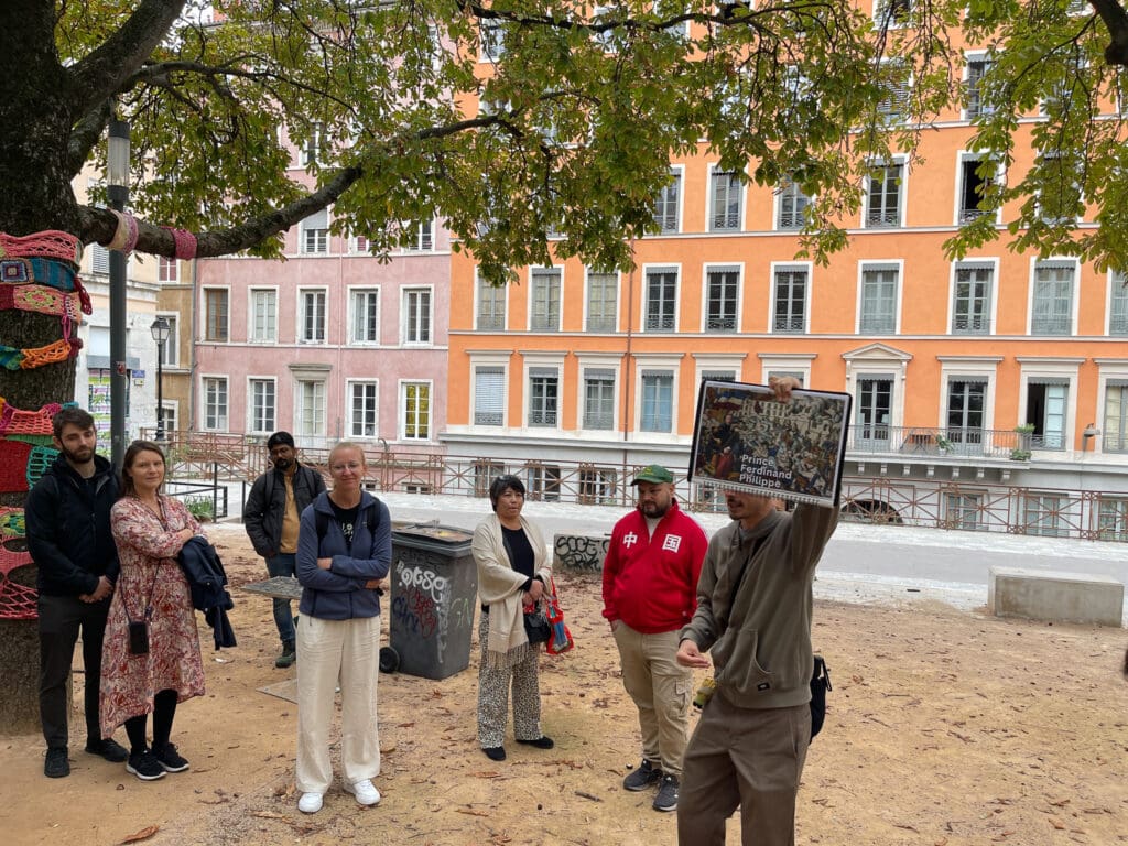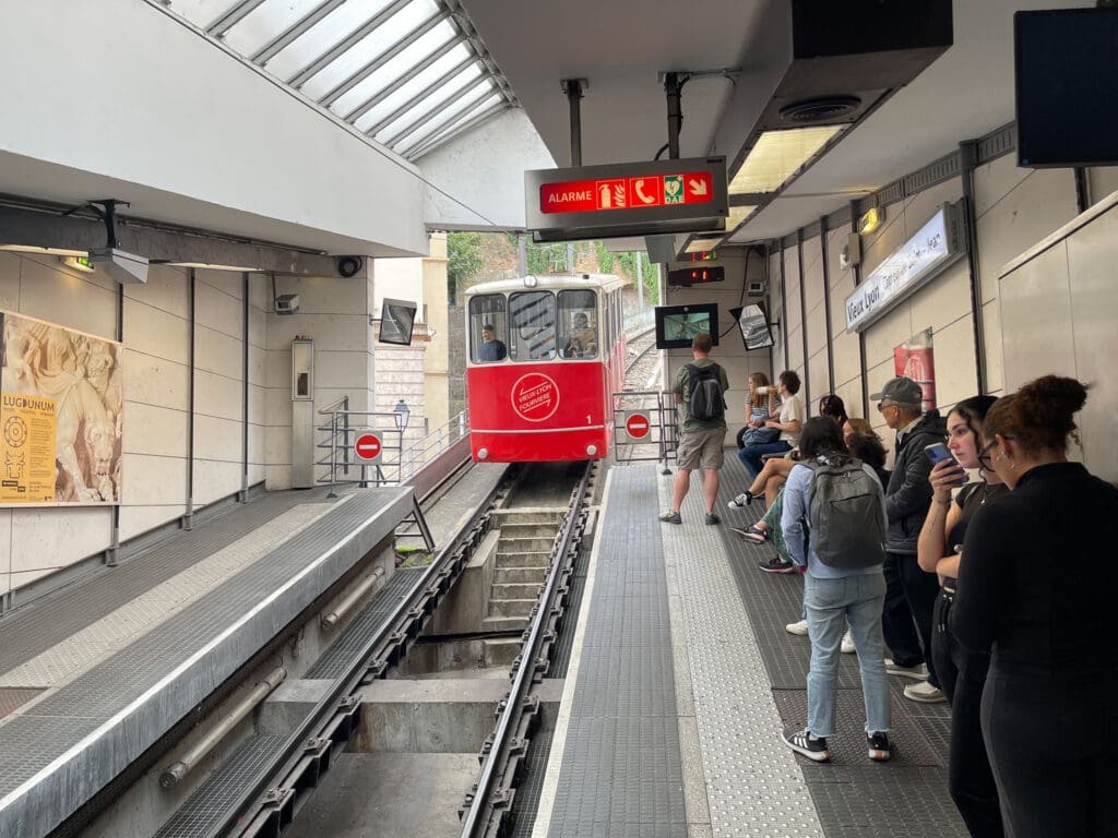 Det finns ett stort utbud av erbjudanden till turister. Ofta turer med buss eller båt och oftast en audioguide. Priset blir därefter. En stadsvandring med en guide passade bättre. Två timmar till ett bra pris. Guiden Quentin hör av sig och avråder en promenad uppför till mötesplatsen Croix-Rousse. Vi tar metro M3 som ursprungligen var en kuggstångsbana öppnad 1891. Den byggdes om till metrostandard 1974, men fortfarande med kuggstångsdrift. Stationen Croix-Paquet sägs vara stationen med brantast lutning i världen, 170 promille! Det är så brant att man måste hålla i sig för att inte glida av sätet.