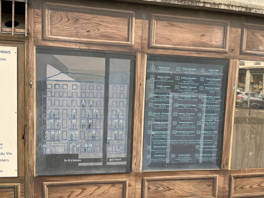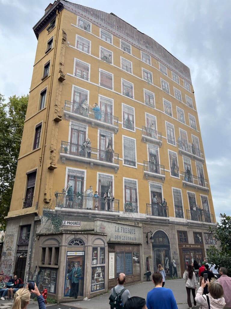 Det finns många väggmålningar i Lyon. En sådan är la Fresque des Lyonnais där personer som var betydelsefulla för Lyon finns porträtterade på balkonger eller i fönster. I gatuplanet finns målningar på ännu levande personer. Efter deras bortgång blir de flyttade uppåt till en balkong eller ett fönster.