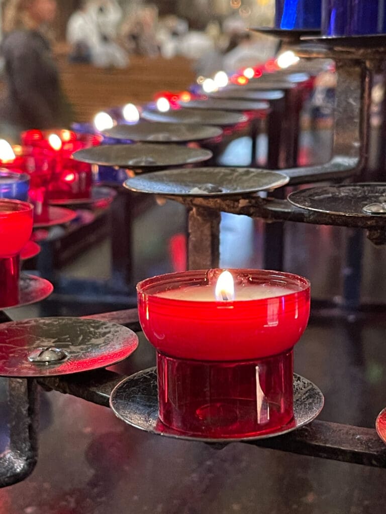 Linbanan T2 upp till Basilique Notre-Dame de Fourvière. Basilikan stod färdig 1896. Ett ljus brinner för dem som inte är med oss längre.