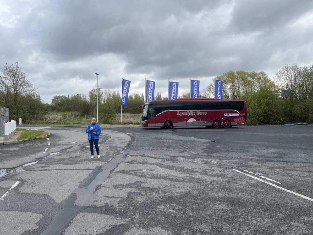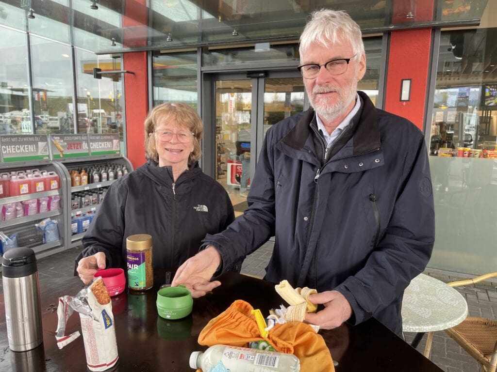 Utanför Kassel tar vi en paus vid ett Tankstelle utanför Kassel. Nu är ryggan laddad och kåsorna är med. Det blir alltså pensionärsfika utanför butiken.