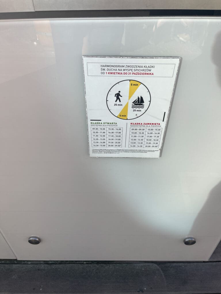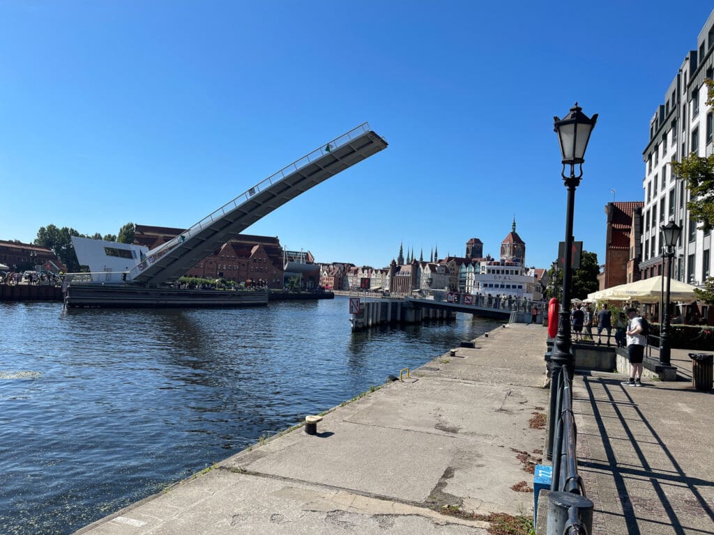 Floden Wisla har flera armar i staden och flera broar behövs därför. För att inte hindra den intensiva sjöfarten med utflyktsbåtar är några av broarna öppningsbara. Broarna är öppna för sjöfarten en halvtimme i taget och nästa halvtimme stängda och då tillgängliga för gående för ett en halvtimme senare återigen vara öppna för sjöfarten.