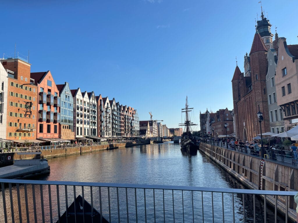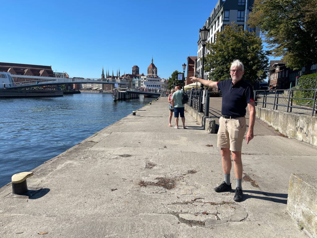 Färjan från Nynäshamn ska snart lägga till i Gdansk. Hamninloppet i floden Wislas mynning är smalt, men ändå lyckas kaptenen vända fartyget. Genom att utnyttja några sidoarmar som ger tillräcklig bredd går det att få fören att peka ut mot havet.