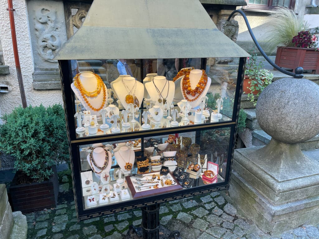 Längs den parallella Mariackagatan trängs stånden med bärnstenar.