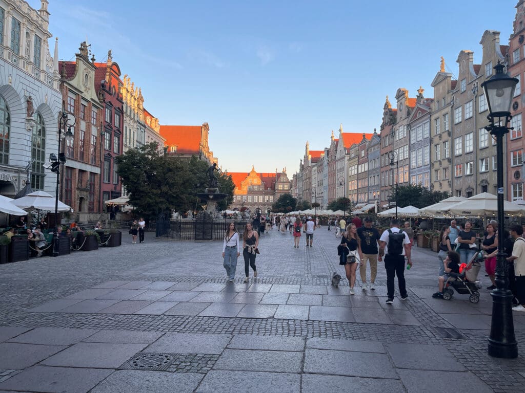 Gamla stan har gott om gågator, oftast med gatsten. Längs paradgatan Długi Targ, (Långa torget) finns många restaturanger och cafeer. Här finns också Neptunistatyn. Här slog vi oss ner och beställde var sin glass samt kaffe. Det var nog den godaste glassen jag har ätit. Jag klarar inte av att räkna upp ingredienserna, men det var i alla fall betydligt mer än bara glassen.