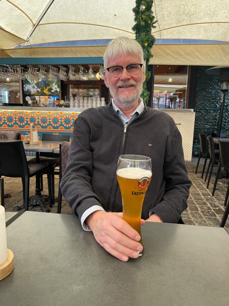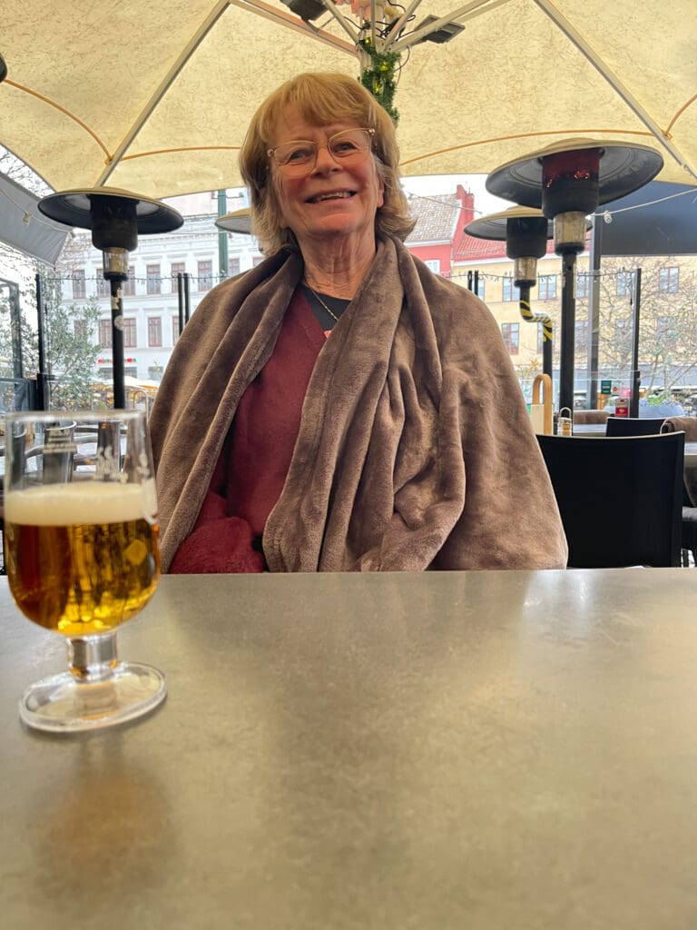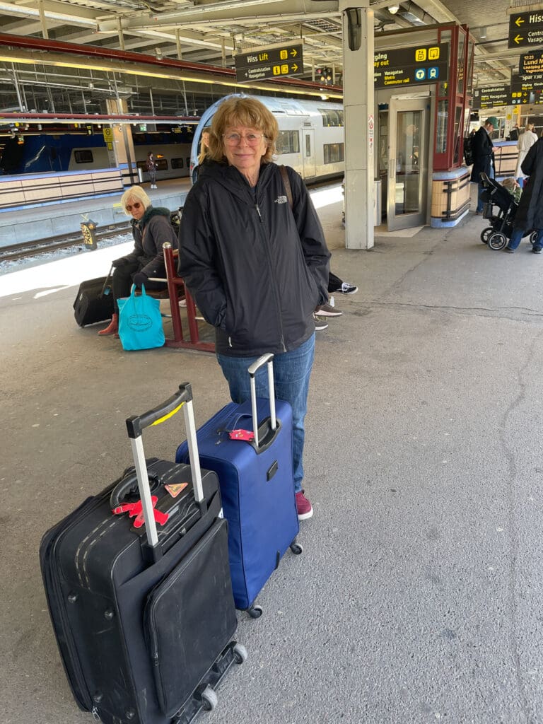 Ryggan var laddad med ”pensionärs-fika” att förtäras på tåget. Allt fanns där, kaffepulver, varmt vatten, kakor osv. De hopfällbara kåsorna lyste dock med sin frånvaro. De var ju framplocka! Nåväl, det fanns ju en fungerande bistro och på Naturkompaniet i Malmö inköptes nya kåsor.